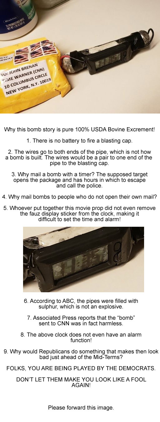 Dr. James – glad to see you back! I suspected this was another false flag with poorly constructed pipe bombs and sending them to the Dem’s before the mid-term elections to sway the people. But as you have pointed out, more people are not falling for these blatant criminal acts committed by the back room boys. It’s time we all unite instead of being more divided and go after the perpetrators!